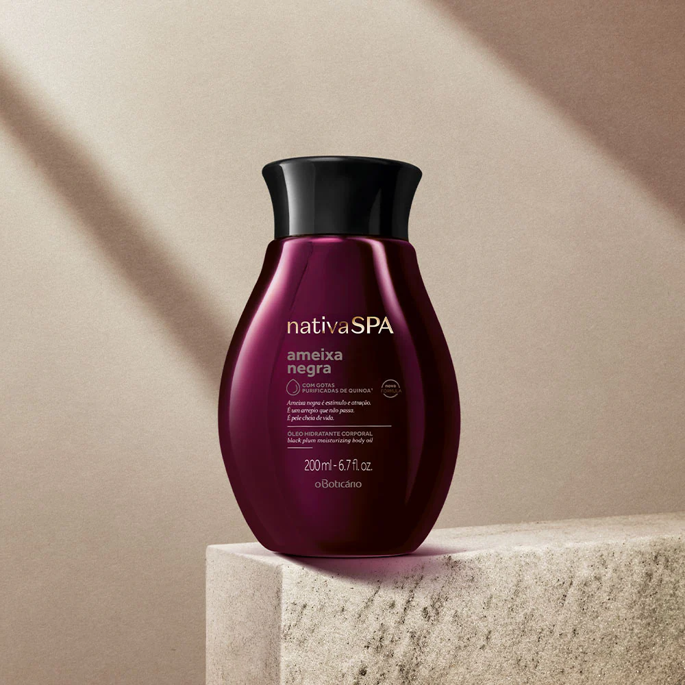 Com uma textura inovadora e surpreendente, o Óleo Hidratante Corporal Nativa SPA Ameixa Negra vai deixar a pele com um toque aveludado e sedoso. O óleo hidratante corporal potencia a hidratação da pele não só pelas propriedades hidratantes e nutritivas do extrato de Ameixa, mas também pela sua fórmula desenvolvida com Extrato de Girassol e gotas purificadas de Quinoa, que devolve a vitalidade da pele potenciando o colagénio e previnindo a perda de elasticidade.